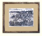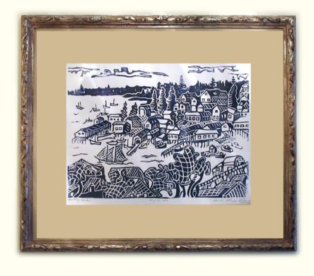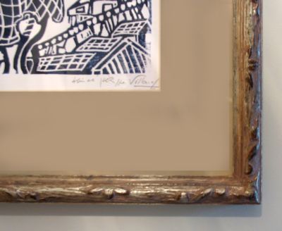 This carved and silver-gilt frame (detail at right) was made for a woodcut from the Villard Atelier in Boothbay, Maine. Click on above image for larger version.
