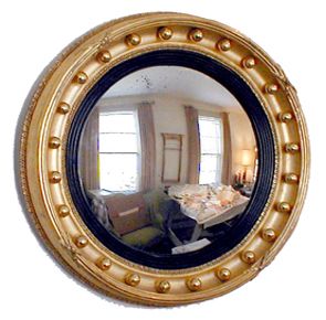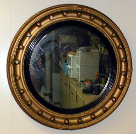 Restoration included new gesso on spherules and water gilding, and replacing flat mirror plate with a lightly distressed convex mirror. This mirror would now be the focal point of any room. |