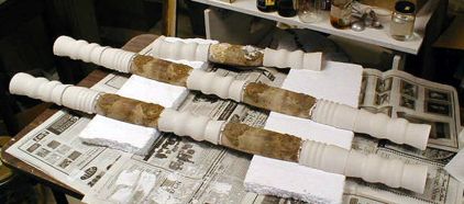 At one point, someone must have attempted regilding. There was a lot of what appeared to be red clay coating parts of it (but they apparently did not add glue to the clay), and they applied it directly to wood, rather than gesso. My guess is that they tried to learn gilding from a book, and gave up on this project. Due to lack of gesso in some areas, and questions about the stability of existing gesso due to layering, it was decided that all areas to be water gilt and burnished would have remaining gesso stripped, and new gesso applied. Infills and castings were used to replace missing sections of ornament. Gilded using both water gilding and oil gilding, a warm toning and light/medium distressing.