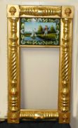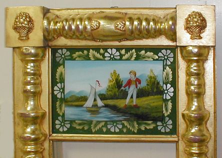 Another typical Empire period split baluster with heavy, rope-turned balusters and composition ornament on corner blocks. I really like the boldness of this period. Needed complete regilding (under the gold overpaint I also found avocado green "antique finish", probably done circa 1970. The reverse-painted tablet that came with this was old, but possibly not original. In addition, it was one of the ugliest ones I had ever seen. I was almost glad there was a chunk off of one corner, as it gave me an excuse to do a different one. More reverse-painted and eglomise panels for mirrors.