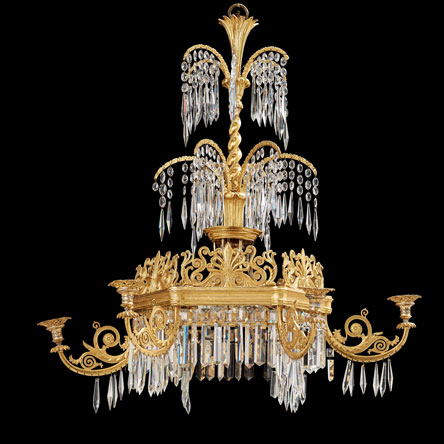 This project is a Karl Schinkel chandelier frame including metal and wood components.Karl Schinkel chandelier frame including metal and wood components. A related chandelier (not the subject) is shown above. In general, condition is fair/good. Some wood components have pieces broken off (but still extant), some minor losses. Metal components have overpaint and or small losses to gilding and base. Minor wood repairs/replacements will be needed. Most condition issues relate to the gilded surfaces. Goal is to have a consistent appearance reflecting the original intent plus appropriate, but not excessive age related conditions. No components should show previous partial repairs. Many components, particularly the metal pieces will be stripped and entirely regilded.
